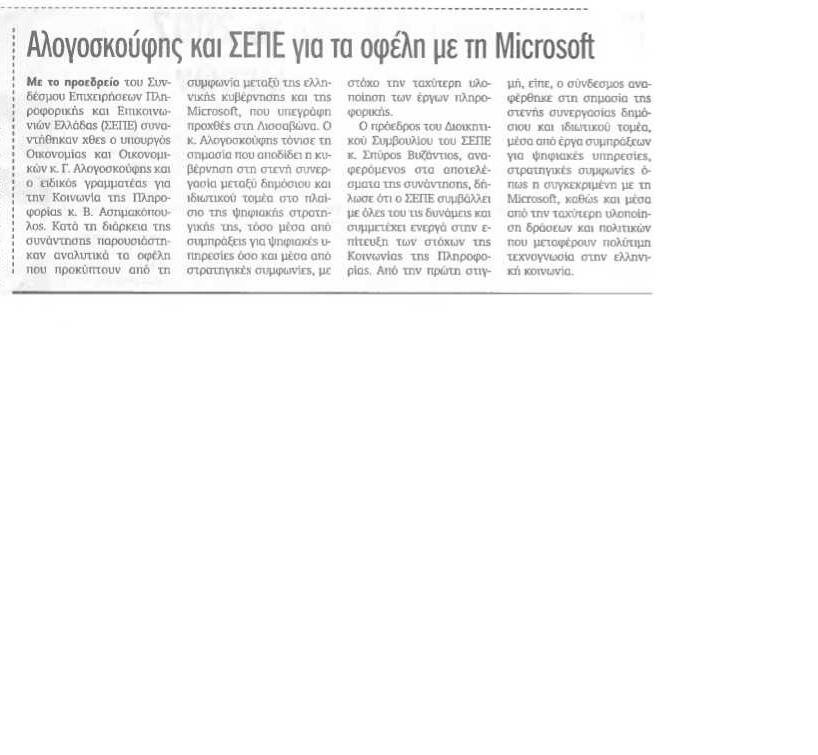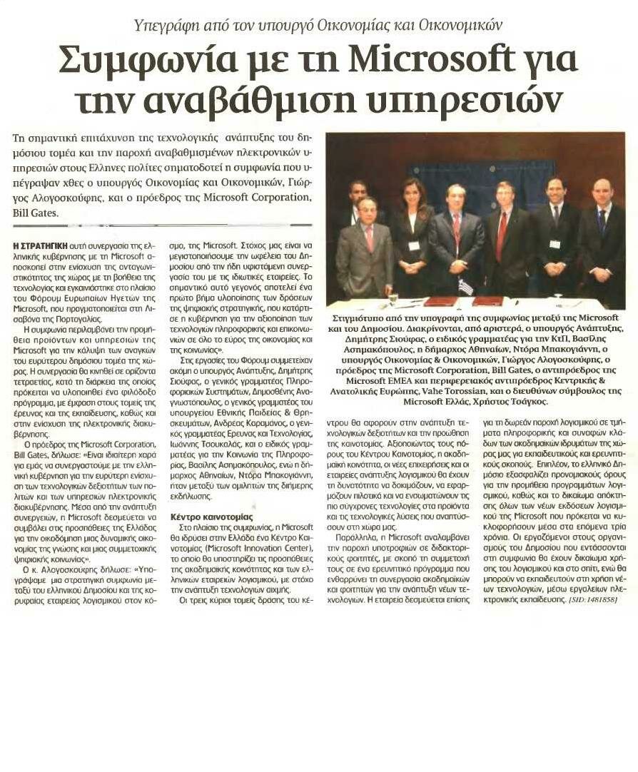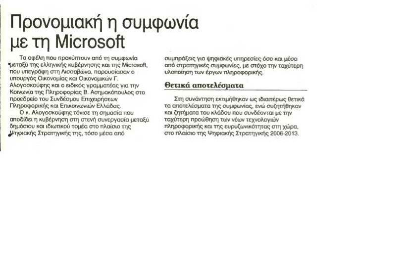 Στρατηγική συμφωνία μεταξύ της ελληνικής κυβέρνησης και της Microsoft, υπέγραψαν την 1η Φεβρουαρίου στη Λισαβόνα, ο υπουργός Οικονομίας και Οικονομικών, Γιώργος Αλογοσκούφης, και ο πρόεδρος της Microsoft, Μπιλ Γκέιτς, στο πλαίσιο υλοποίησης της νέας Ψηφιακής Στρατηγικής 2006-2013 και της στενότερης συνεργασίας του ελληνικού δημοσίου με τις εταιρείες του ιδιωτικού τομέα για θέματα Πληροφορικής.