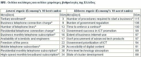 Στα ισχυρά σημεία της χώρας, είναι το ποσοστό των αποφοίτων της τριτοβάθμιας εκπαίδευσης, η διείσδυση των τηλεπικοινωνιακών γραμμών, η διαθεσιμότητα μηχανικών κ.ά. Για τη χαμηλή βαθμολογία της χώρας ευθύνεται η πολυετής καθυστέρηση στα έργα ΤΠΕ του δημοσίου, μέσω των οποίων θα μπορούσαν να εκσυγχρονιστούν οι υπηρεσίες και να βελτιωθεί η παραγωγικότητα. Και παρά το γεγονός ότι δεν έχει ενσωματωθεί η τελευταία ανάπτυξη της ευρυζωνικότητας, που σημειώθηκε στη διάρκεια του περασμένου έτους, είναι σίγουρο ότι τα βήματα που κάνει η χώρα είναι πολύ μικρότερα από εκείνα που κάνουν άλλες χώρες.