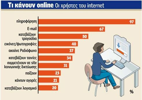 Σύμφωνα, μάλιστα, με την έρευνα, υπάρχει ακόμη ένα 7% του πληθυσμού το οποίο αποτελεί δυνητικούς χρήστες του Internet. Οι περισσότεροι χρήστες έχουν το Διαδίκτυο για πληροφόρηση (97%), e-mail (67%), ενώ οι μισοί (50%) «κατεβάζουν» τραγούδια και το 34% ταινίες.