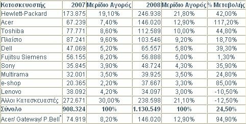 Στην Ελλάδα, το 4ο τρίμηνο του 2008 πουλήθηκαν συνολικά 375.271 τεμάχια σε σύγκριση με 302.026 τεμάχια το αντίστοιχο διάστημα του 2007. Η Hewlett Packard έκοψε για μία ακόμη φορά πρώτη το νήμα των υψηλών επιδόσεων, με αύξηση 49,9%. Ακολούθησε η Acer με 87,6%, η Toshiba με 39,3% η Πλαίσιο με 2,8% και η Sony με 18,1%.