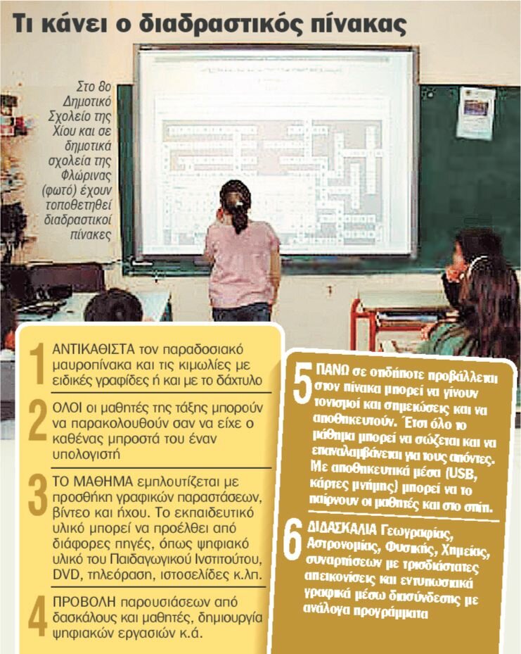 Στο 8ο Δημοτικό της Χίου, οι πίνακες αυτοί τοποθετήθηκαν και στις έξι αίθουσες και χρησιμοποιούνται πλέον σε όλα τα μαθήματα: η Γεωγραφία είναι τρισδιάστατη μέσω ειδικών προγραμμάτων, οι εξισώσεις και οι σημειώσεις γράφονται με το δάχτυλο ή την ειδική γραφίδα και μπορεί να αποθηκευτούν ώστε να τις μελετήσουν αργότερα όσοι απουσίαζαν στο μάθημα, ενώ σε κάθε μάθημα το ειδικό ψηφιακό υλικό του Παιδαγωγικού Ινστιτούτου είτε ανεξάρτητων δημιουργών βοηθάει τον εκπαιδευτικό και «ζωντανεύει» το μάθημα. Έτσι, όπως λέει στα «ΝΕΑ» ο διευθυντής του σχολείου, κ. Λευτέρης Μερεσεντζής, τους τελευταίους μήνες οι μαθητές διαγκωνίζονται για να σηκωθούν στον πίνακα, σε πλήρη αντίθεση με την κλασική εικόνα του μαθητή που το θεωρεί αγγαρεία!