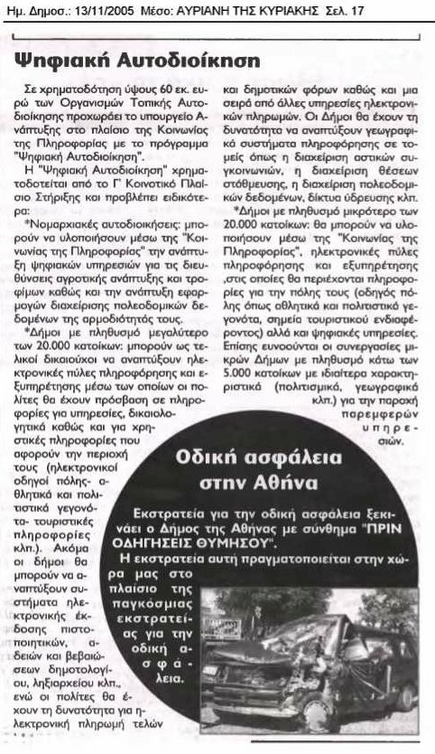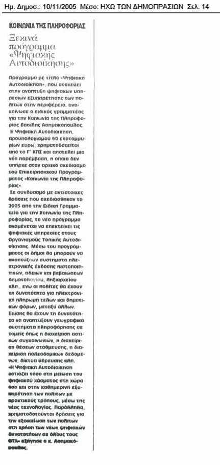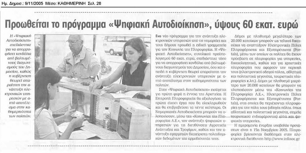 Κάνοντας πράξη τη δέσμευση για εξυπηρέτηση του πολίτη, που περιλαμβάνεται στην Εθνική Ψηφιακή Στρατηγική 2006-2013, η Ειδική Γραμματεία για την Κοινωνία της Πληροφορίας προωθεί από τον Νοέμβριο του 2005 μεγάλη παρέμβαση με τίτλο «Ψηφιακή Αυτοδιοίκηση».