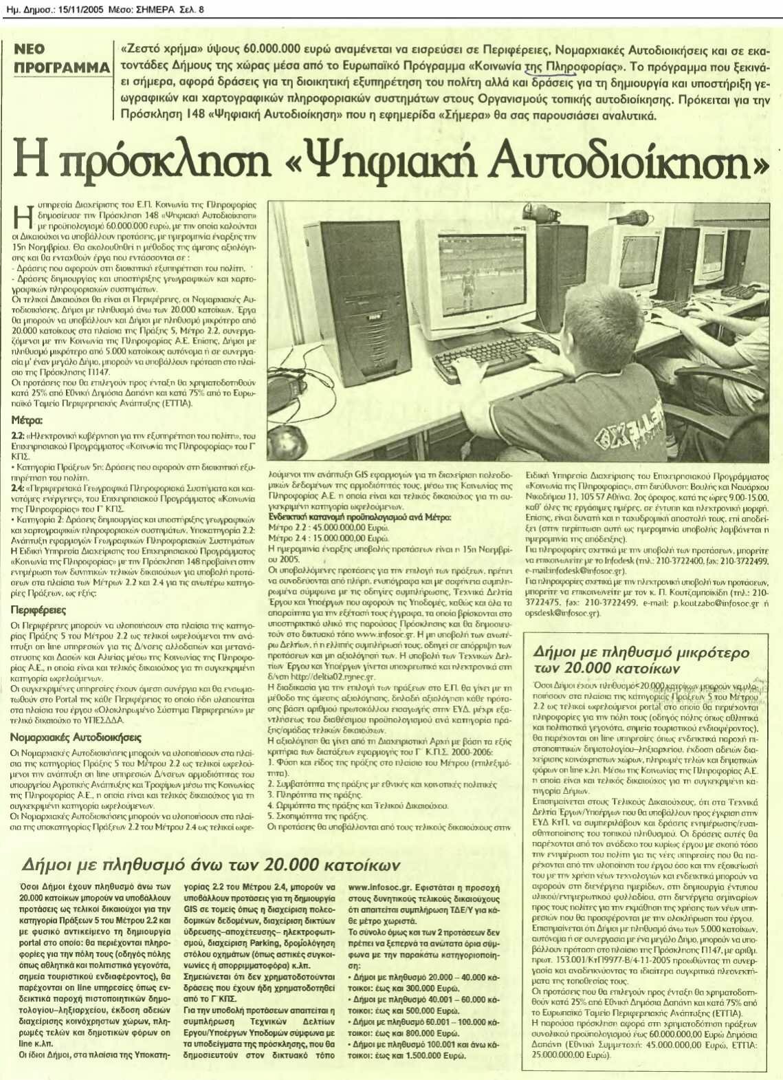 Η υποβολή προτάσεων για την «Ψηφιακή Αυτοδιοίκηση» ξεκίνησε στις 15 Νοεμβρίου 2005. Οι ενδιαφερόμενοι μπορούν να βρουν περισσότερες πληροφορίες στη σελίδα της Πρόσκλησης (Π148).