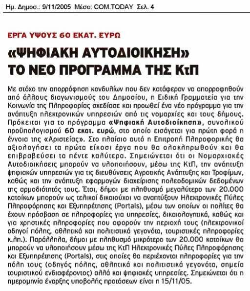 - Δήμοι με πληθυσμό κάτω των 20.000 κατοίκων μπορούν να υλοποιήσουν μέσω της ΚτΠ ΑΕ ηλεκτρονικές πύλες πληροφόρησης και εξυπηρέτησης (Portals), με πληροφορίες για την πόλη τους (οδηγό πόλης, αθλητικά και πολιτιστικά γεγονότα, σημεία τουριστικού ενδιαφέροντος κλπ.), αλλά και ψηφιακές υπηρεσίες.