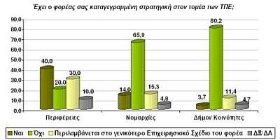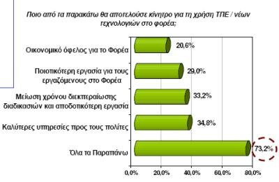 Επιπλέον, οι περισσότεροι φορείς -με εξαίρεση τις Νομαρχίες- δεν χρησιμοποιούν τις ΤΠΕ ως εργαλείο πολιτικής. Δηλώνουν όμως ότι θα επιθυμούσαν να το κάνουν, γνωρίζοντας τα οφέλη που θα που θα προκύψουν, όπως η παροχή καλύτερων υπηρεσιών και η αποδοτικότερη και ποιοτικότερη εργασία.