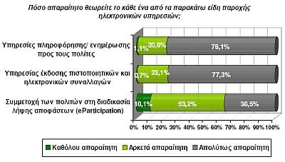 Ενδιαφέρον, ωστόσο, παρουσιάζει το γεγονός ότι ενώ οι περισσότεροι φορείς της περιφερειακής και της τοπικής διοίκησης (77,28%) θεωρούν απολύτως απαραίτητη την παροχή ηλεκτρονικών υπηρεσιών από το φορέα προς τους πολίτες, μόνο το 36,75% αυτών θεωρούν απολύτως απαραίτητη την ηλεκτρονική συμμετοχή των πολιτών σε διαδικασίες λήψης αποφάσεων (e-participation).