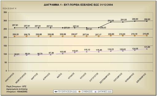 Refer to the graphic representation of the absorbent percentage (Communal Participation) of the European Social Fund (ESF) and also the absorbent indicator of the fund chronologically classified from the beginning of the Program until 31/12/2004.