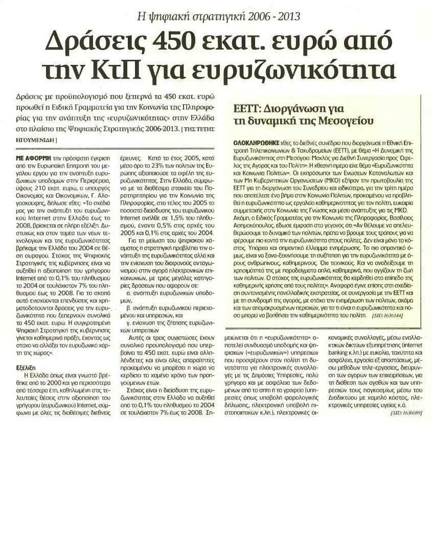 The objective of the Digital Strategy is to increase the utilization of fast Internet from 0.1% of population in 2004 up to at least 7% of our population in 2008. For this cause, investments are supported and actions are financed with regard to broadband services whose cost amount in total to over € 450 million.